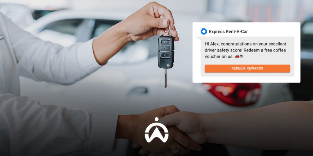 A person hands over car keys, accompanied by a message congratulating on a safe driving score and offering a free coffee voucher.